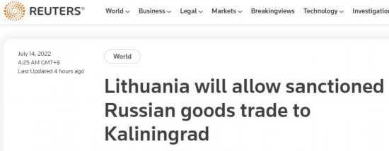 路透社说,尽管表示将遵循欧盟新的指导方针,但立陶宛外交部在一份声明中声称,此前阻止许多受制裁货物运输到加里宁格勒的规定“更容易接受”:“加里宁格勒过境规则可能会给人留下一种不合理的印象,即跨大西洋共同体正在软化其对俄罗斯的立场和制裁政策。”