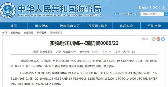 琼航警0089/22,北部湾,7月14日0600时至2200时将在19-43.0N/108-54.0E、19-51.5N/109-01.5E、20-10.0N/108-47.3E及 19-53.0N/108-32.5E诸点连线水域范围内进行实弹射击训练。禁止驶入。