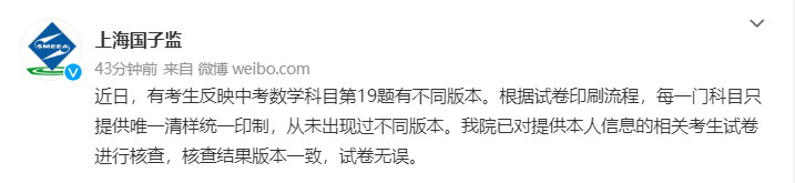 荔枝新闻讯 近日,有考生反映上海中考数学科目第19题有不同版本。7月14日,上海市教育考试院在其官方微博上通报,根据试卷印刷流程,每一门科目只提供唯一清样统一印制,从未出现过不同版本。上海市教育考试院已对提供本人信息的相关考生试卷进行核查,核查结果版本一致,试卷无误。