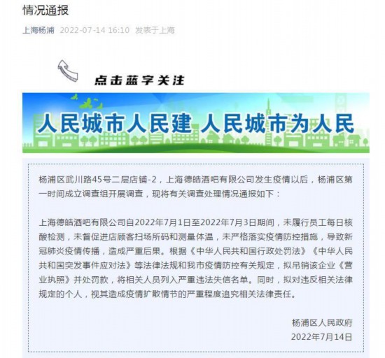 荔枝新闻讯 上海市杨浦区武川路45号二层店铺-2,上海德皓酒吧有限公司发生疫情以后,上海市杨浦区第一时间成立调查组开展调查。7月14日, “上海杨浦”微信公众号将有关调查处理情况通报如下: