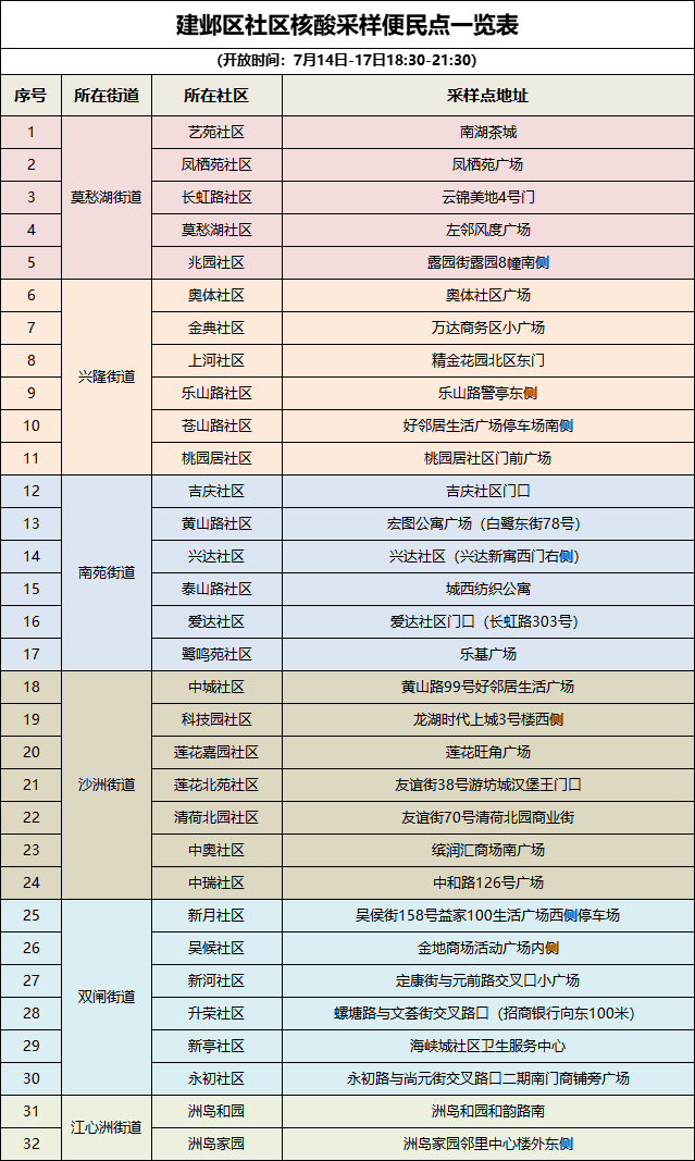 1.建邺区7月14日—17日社区核酸采样便民点一览表