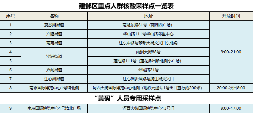 建邺区重点人群核酸采样点一览表