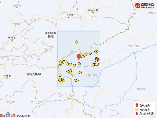 历史地震:根据中国地震台网速报目录,震中周边200公里内近5年来发生3级以上地震共244次,最大地震是2020年1月19日在新疆喀什地区伽师县发生的6.4级地震(距离本次震中145公里),按震级大小前50次历史地震分布如图。