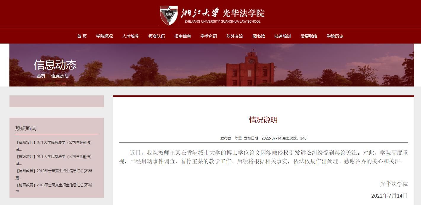 荔枝新闻讯 7月14日,浙江大学光华法学院发布情况说明:近日,浙江大学光华法学院教师王某在香港城市大学的博士学位论文因涉嫌侵权引发诉讼纠纷受到舆论关注。对此,学院高度重视,已经启动事件调查,暂停王某的教学工作。后续将根据相关事实,依法依规作出处理。感谢各界的关心和关注。