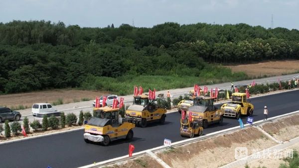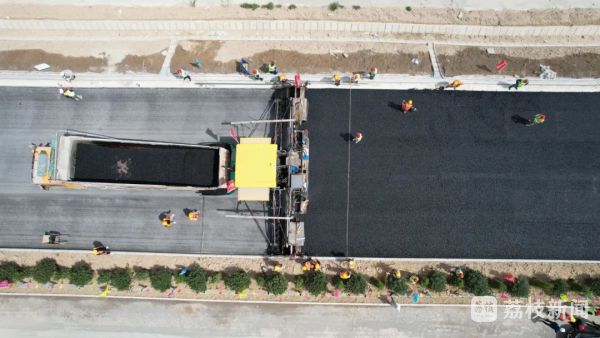 在盐射高速建设现场,施工人员正操作着摊铺机、压路机等各类施工机械,紧张地进行路面沥青摊铺作业。