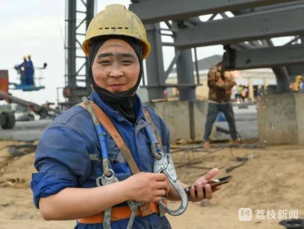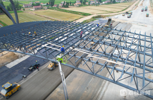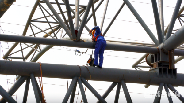 抬头望去,在高速主线收费站的钢架上,施工人员也在忙碌地进行作业。太阳的暴晒让钢架变得滚烫,“至少有60℃,即使戴着厚厚的手套,也仍然很烫手。”刚从钢架上下来喝水的工人谭万强向记者介绍道,“钢架施工除了要佩戴好安全绳外,还要穿上厚厚的专用劳保服,特别闷热。”