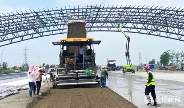 在盐射高速出入口路段,施工人员正紧锣密鼓地开展收费站钢架建设和水泥路面的摊铺、整理工作。压路机和摊铺机相互配合前行,工人们不断挥动着手里的铁锹,配合机器进行路面摊铺作业,汗水浸湿了工人身上的衣服,皮肤也被晒得黝黑发亮。