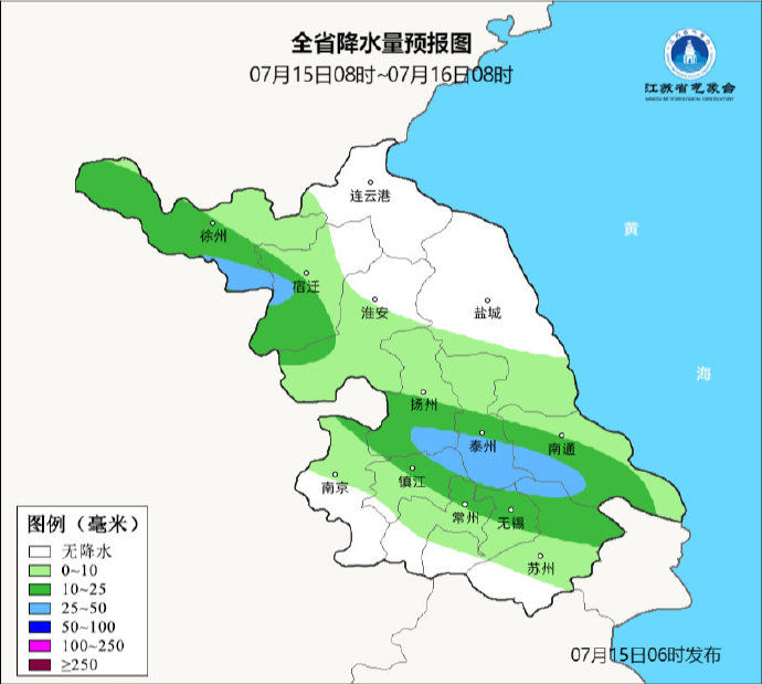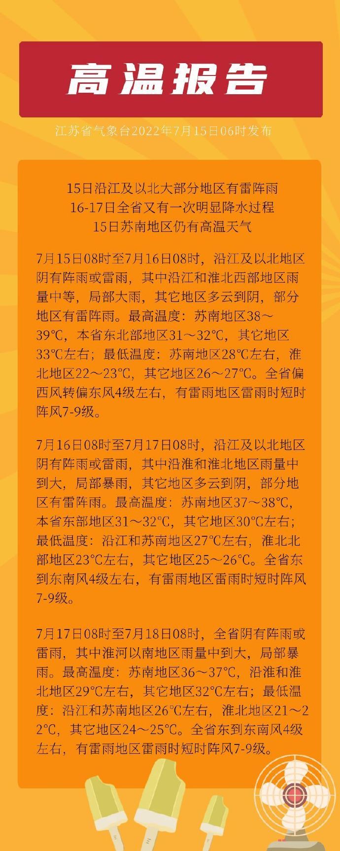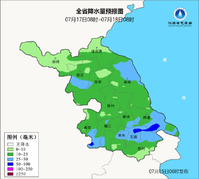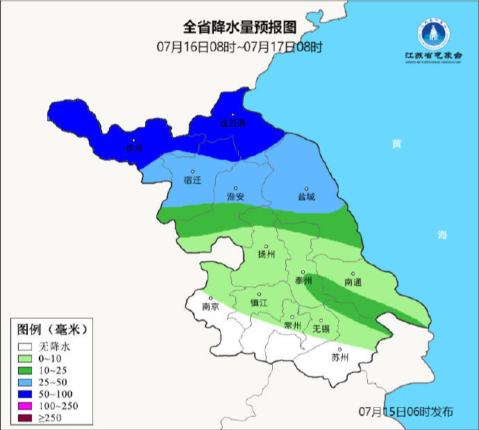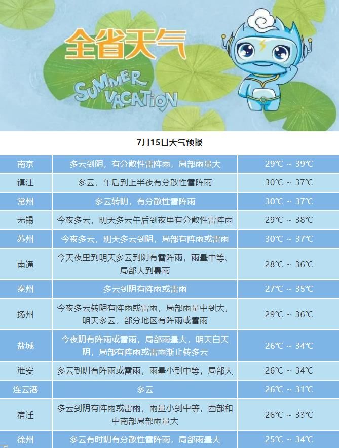 7月15日08时至7月16日08时,沿江及以北地区阴有阵雨或雷雨,其中沿江和淮北西部地区雨量中等,局部大雨,其它地区多云到阴,部分地区有雷阵雨。最高温度:苏南地区38~39℃,本省东北部地区31~32℃,其它地区33℃左右;最低温度:苏南地区28℃左右,淮北地区22~23℃,其它地区26~27℃。全省偏西风转偏东风4级左右,有雷雨地区雷雨时短时阵风7-9级。