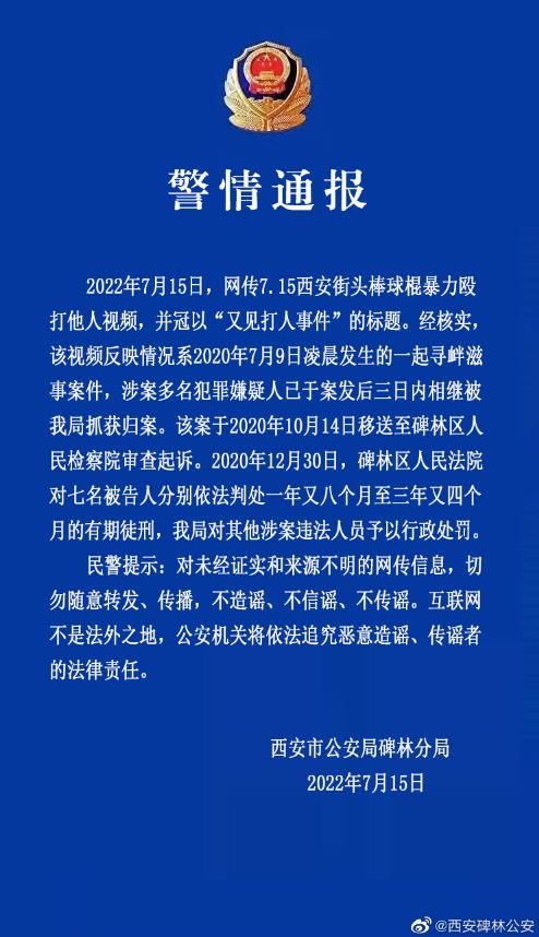 2022年7月15日,网传7. 15西安街头棒球棍暴力殴打他人视频,并冠以“又见打人事件”的标题。经核实,该视频反映情况系2020年7月9日凌晨发生的一起寻衅滋事案件,涉案多名犯罪嫌疑人已于案发后三日内相继被我局抓获归案。该案于2020年10月14日移送至碑林区人民检察院审查起诉。2020年12月30日, 碑林区人民法院对七名被告人分别依法判处一年又八个月至三年又四个月的有期徒刑,我局对其他涉案违法人员予以行政处罚。