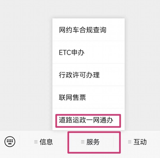 扫描上方二维码关注交通运输部微信公众号,点击菜单栏【服务】,选择【道路运政一网通办】进入小程序。