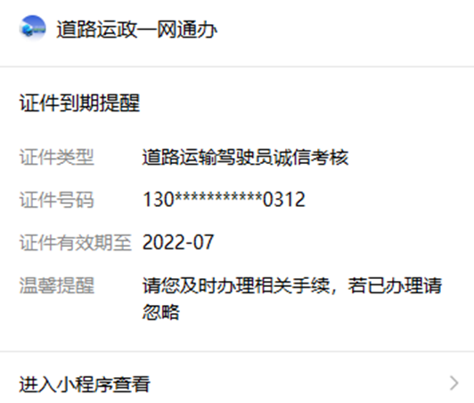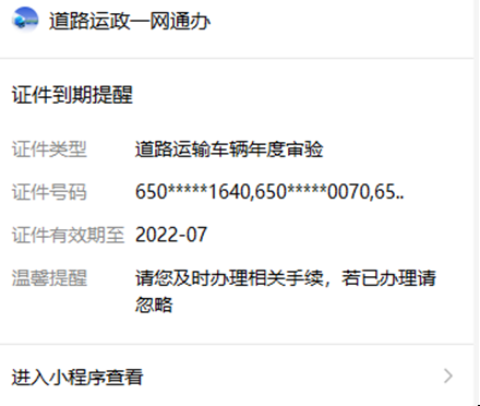 此外,针对道路运输经营许可证、从业资格证、道路运输证等证件,小程序也提供证件到期换证自动提醒服务。