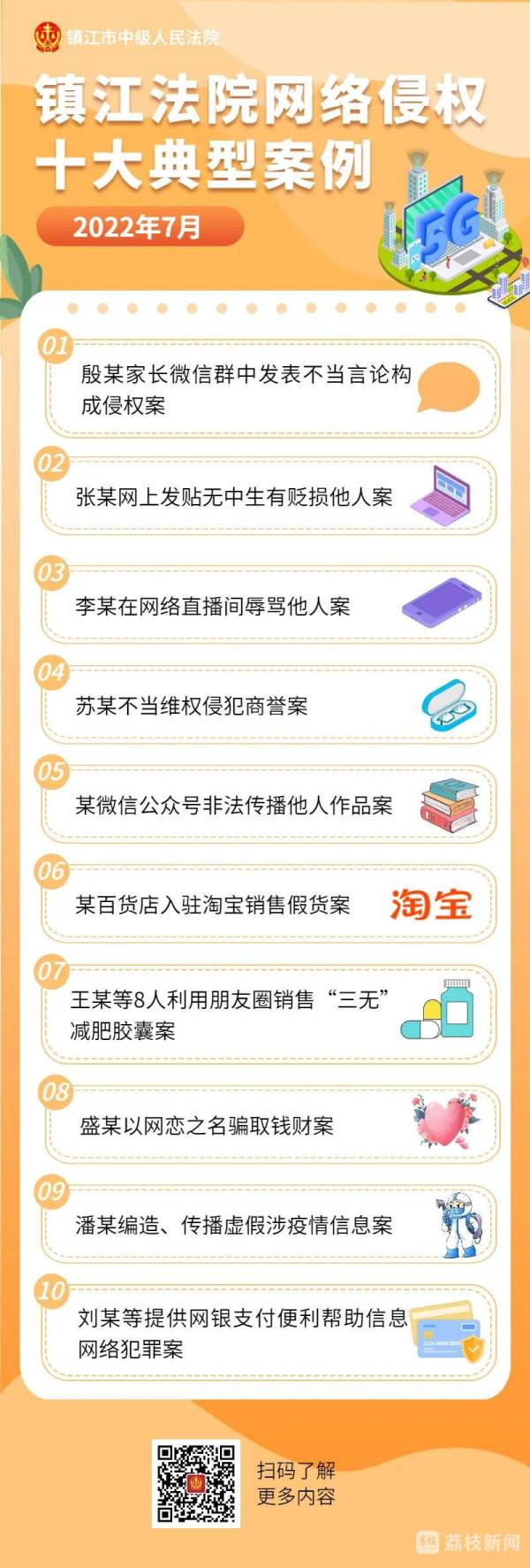期间,镇江中院报送的“十大网络侵权案例发布”,入选2022年镇江市“普法e同行”十大创新项目。记者注意到,这些案例既有网上发帖、直播间骂人侵犯名誉权的民事案件;也有侵犯商标、著作权等知识产权案件;更有借助网络实施诈骗、传播虚假信息的刑事案件。