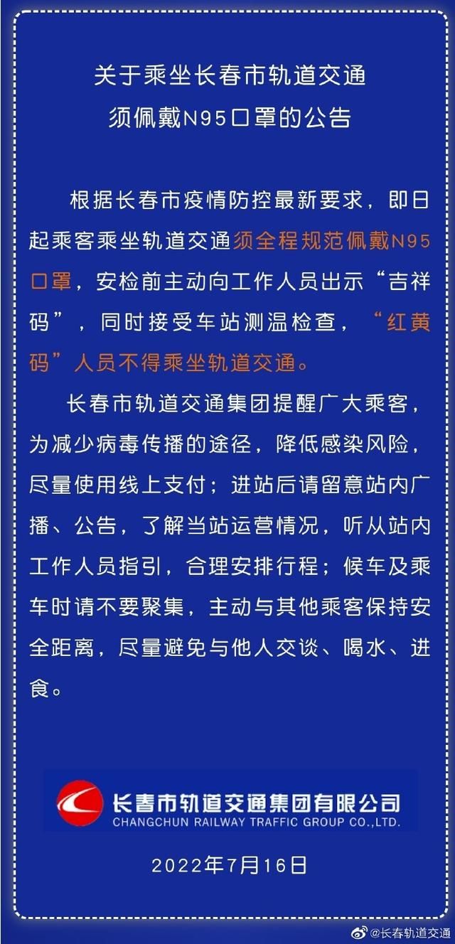 荔枝新闻讯 据@长春市轨道交通集团有限公司 官方微博消息,根据长春市疫情防控最新要求,7月16日起乘客乘坐轨道交通须全程规范佩戴N95口罩,安检前主动向工作人员出示“吉祥码”,同时接受车站测温检查,“红黄码”人员不得乘坐轨道交通。