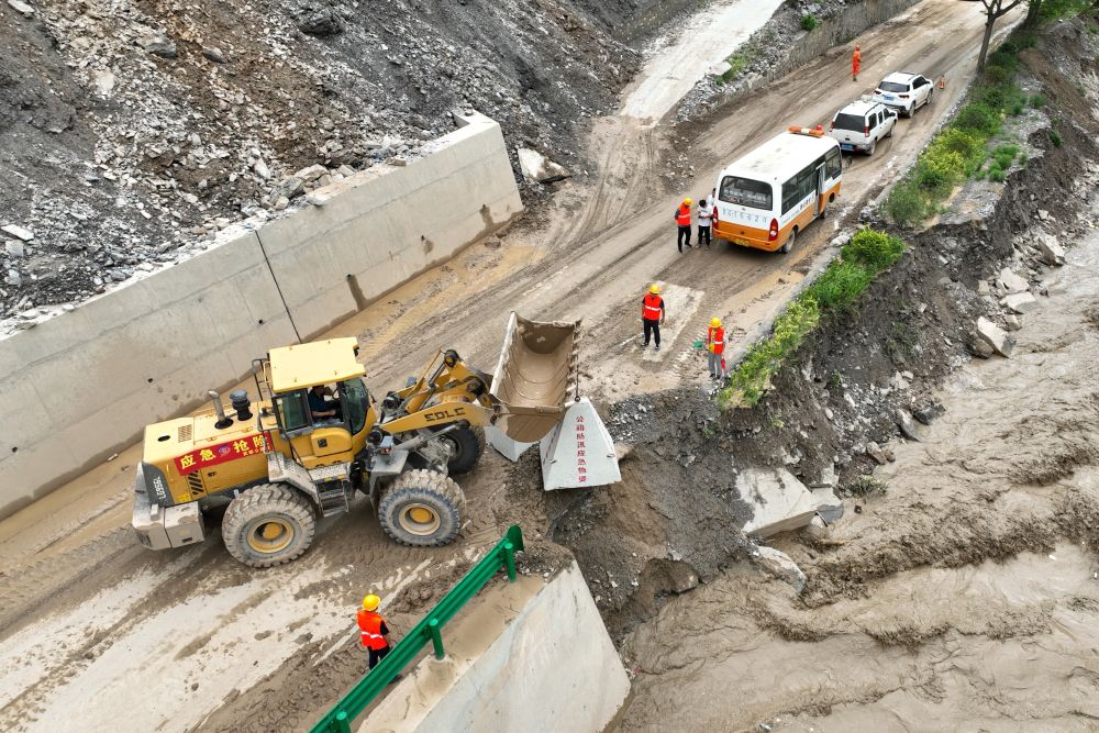 7月16日,陇南市武都区公路段工作人员正在抢修一处水毁道路。(图片来源:陇南市武都区委宣传部)