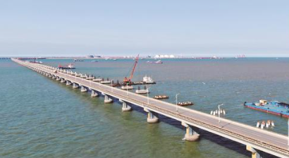 黄海二桥工程总投资10亿元,桥梁总长10.035公里,宽13.1米,设计为两轨车道。作为连接能源岛与港区的“主动脉”,二桥正式通车后,黄海大桥整体运输能力将扩大两倍,将成为金光、桐昆等重大产业项目重要的物流运输通道,同时,也能有效保障中石油江苏LNG、江苏国信以及协鑫汇东等接收站液化天然气槽车外运需要,为“产业港、能源岛”建设再添助力。