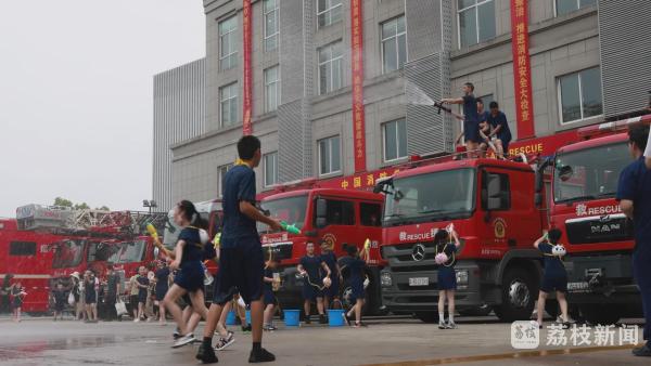 午餐后,小朋友们在消防员的带领下参观了中国大运河博物馆,丰富了课外知识,了解了中国大运河的历史、文化、生态和科技面貌。回到消防救援大队后,小朋友们在各自班长的带领下填充了自己的水枪,开始了最期待的“水枪大战”环节。随着口令落下,小朋友们持着水枪开始“激战”。而消防员们也开出了消防车,拿出消防水枪和小朋友们开始了对战。