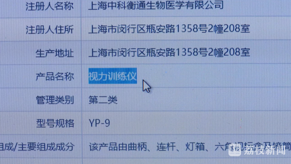 记者注意到,"卫视仪"上的生产许可证号显示其厂家来自上海。通过上海市药监局和国家药监总局的官方网站,记者查询发现,"卫视仪"的正式注册名称叫做"视力训练仪",属于"二类医疗器械",预期用途是"供青少年佩戴训练缓解视疲劳"。也就是说,这款号称能够"恢复视力"的神器,在国家药监总局注册的功能仅仅是"缓解视疲劳"。