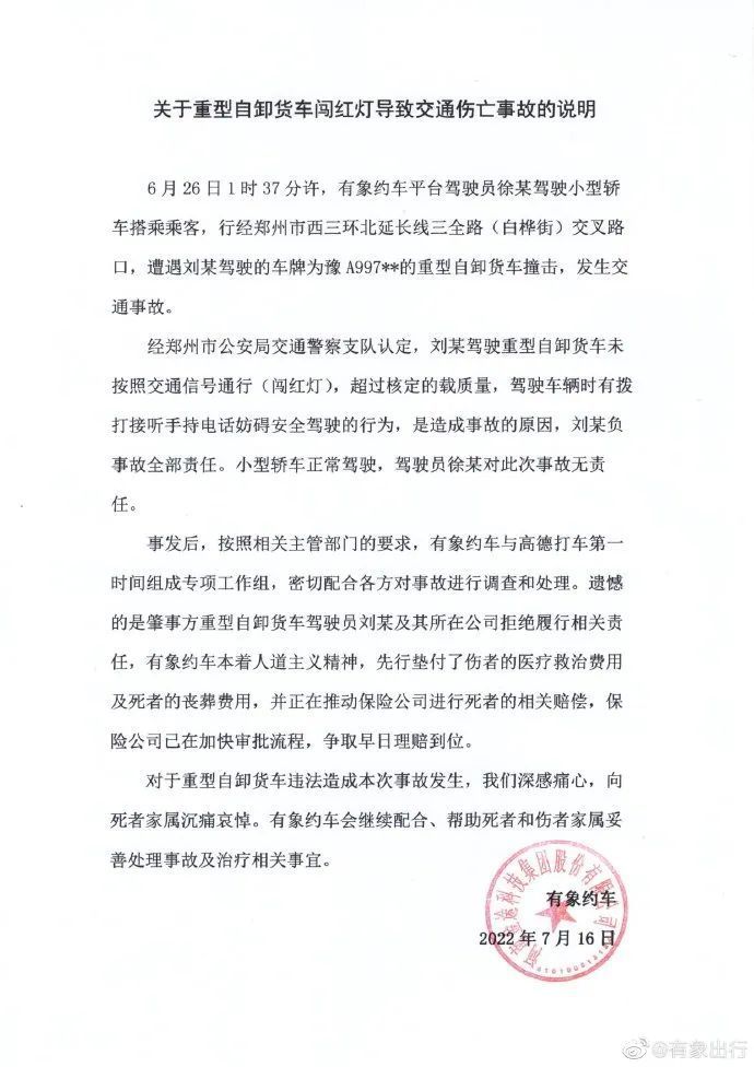 7月16日,有象出行官方微博发布关于重型自卸货车闯红灯导致交通伤亡事故的说明:
