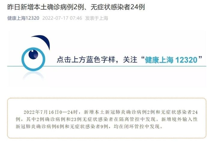 荔枝新闻讯 上海市卫健委今早(7月17日)通报:2022年7月16日0—24时,新增本土新冠肺炎确诊病例2例和无症状感染者24例,其中2例确诊病例和23例无症状感染者在隔离管控中发现。新增境外输入新冠肺炎确诊病例6例和无症状感染者9例,均在闭环管控中发现。