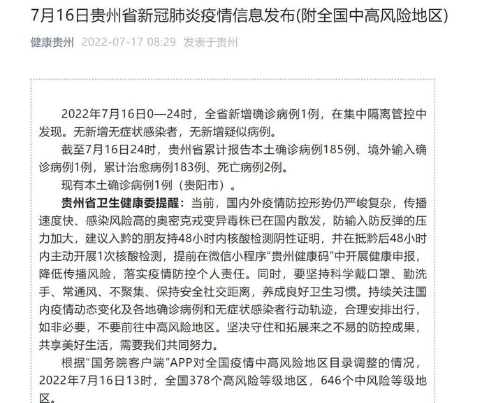 截至7月16日24时,贵州省累计报告本土确诊病例185例、境外输入确诊病例1例,累计治愈病例183例、死亡病例2例。