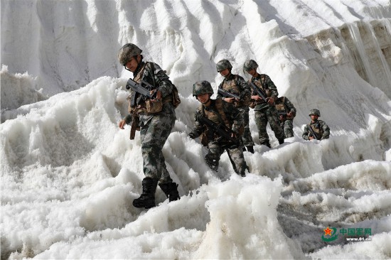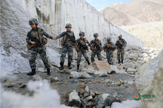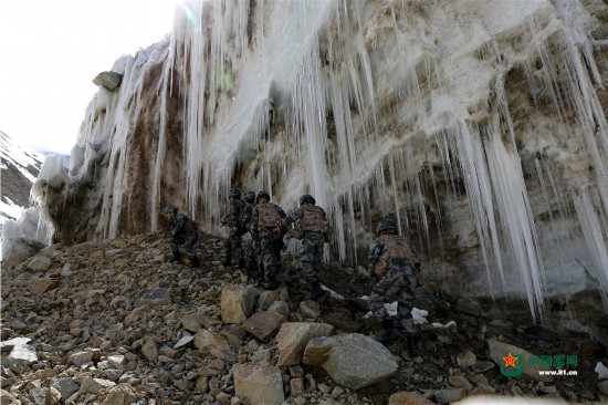 巨大的冰川屹立在眼前,无数冰锥垂立,阳光照射下散发着阵阵寒气。巡逻官兵们克服严寒缺氧,头顶悬冰,脚踏冰河,翻雪山、过达坂。经过4个多小时的艰难跋涉,终于到达了海拔5200多米的巡逻点位,官兵们迅速展开观察、记录。