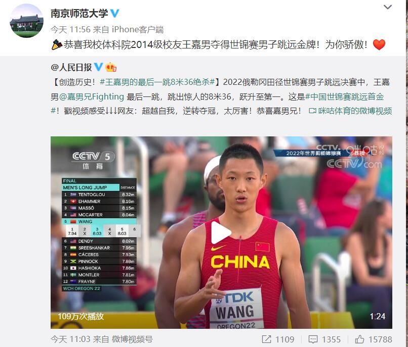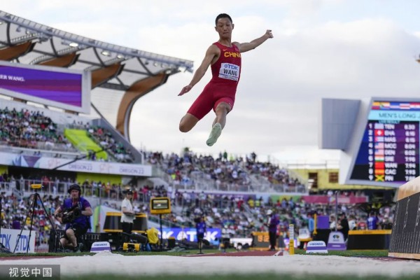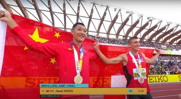 7月17日,2022俄勒冈田径世锦赛男子跳远决赛中,中国选手王嘉男最后一轮跳出8米36,逆转获得金牌!