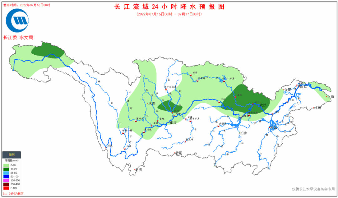 据水文气象预报,未来一周长江流域有两次降雨过程。7月17日至20日,长江流域干流附近自西向东有中到大雨、局地暴雨,过程累计雨量超过50毫米的笼罩面积约50万平方公里,乌江、三峡区间、长江中游干流附近累计面雨量20~100毫米,嘉陵江及汉江上游累计面雨量30~50毫米。7月21日至22日,长江上游自北向南还将有一次中到大雨的降雨过程。考虑预见期降雨,预计沱江、嘉陵江、乌江、三峡区间、汉江、清江、澧水、鄂东北水系将有明显涨水过程,部分支流可能发生超警及以上洪水,局地强降雨引发山洪灾害和中小河流洪水的风险较高。