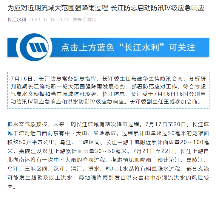 综合考虑气象水文预报和当前流域防汛形势,长江防总、长江委于7月16日16时分别启动防汛Ⅳ级应急响应和洪水防御Ⅳ级应急响应。