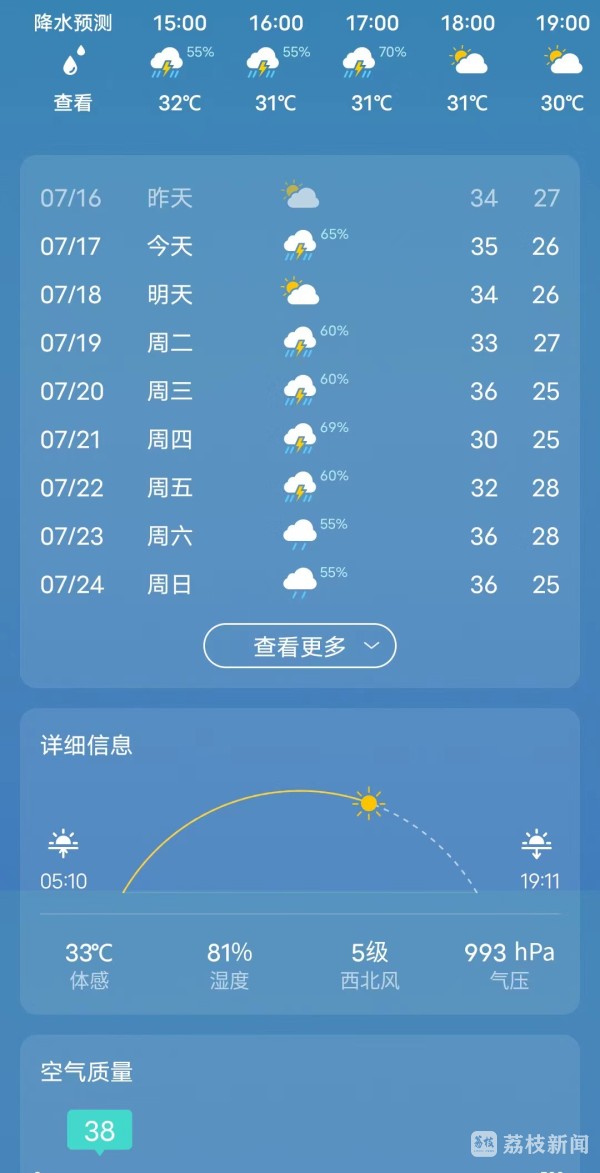 江苏省气象台首席预报员韩桂荣称,今天17号江苏苏南地区最高气温37℃,但是18号起这一段高温天气基本结束,江苏不会像出梅以后连续十多天的高温,之前高温强度很强达到39-40℃,18号以后总体来说,最高气温基本35℃以下。