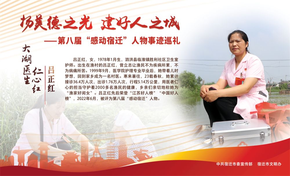 寒来暑往23年,吕正红累计接诊超过36.4万人次,行程近5.14万公里,她用医者仁心的担当守护着2000多名渔民的健康,当地乡亲们亲切地称呼她为“渔家好闺女”。在7月1日举行的第八届“感动宿迁”人物颁奖典礼上,吕正红荣获第八届“感动宿迁”人物称号。