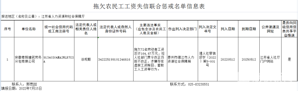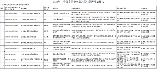 记者获悉,为进一步加大对重大劳动保障违法行为、拖欠农民工工资严重失信行为的惩戒力度,强化对用人单位守法诚信的社会监督,依照《保障农民工工资支付条例》、《重大劳动保障违法行为社会公布办法》、《拖欠农民工工资失信联合惩戒对象名单管理暂行办法》等规定,江苏省人社厅日前公布了省2022年二季度存在重大劳动保障违法行为的10家用人单位。