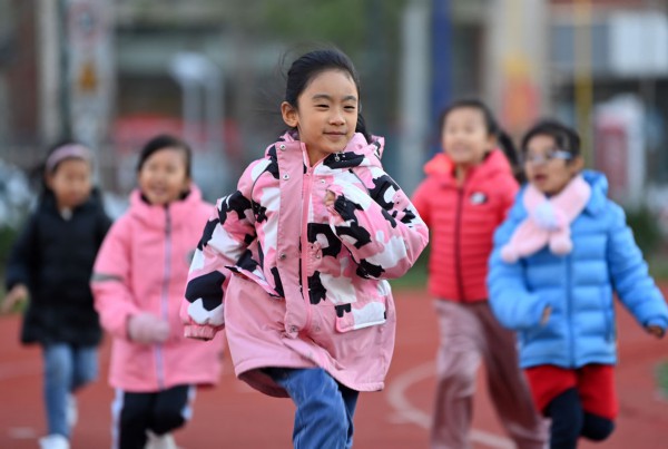 ↑在天津市河西区德贤小学,学生在课后素质拓展课上跑步锻炼(2021年11月11日摄)。