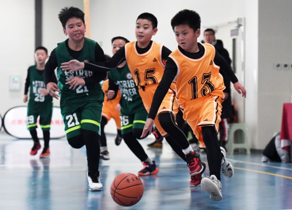 ↑怀柔区第三小学选手在2021年北京市第一届小学生篮球比赛中带球进攻(2021年12月11日摄)。