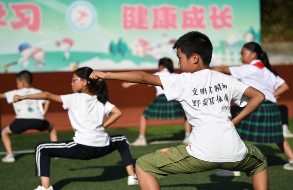 ↑在陕西省安康市平利县老县镇中心小学的操场上,学生们在课后参加武术社团活动(2020年9月7日摄)。