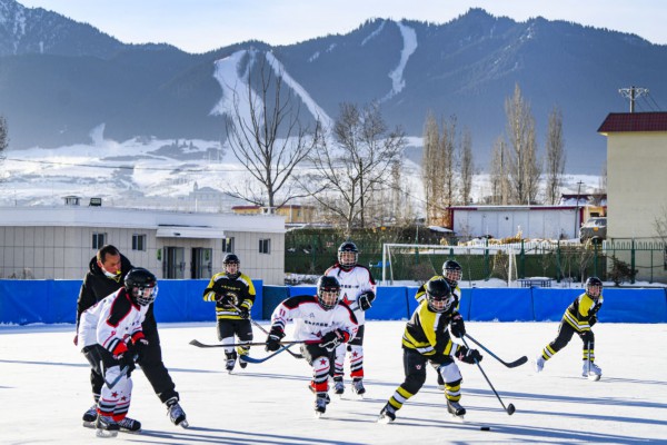 ↑新疆乌鲁木齐市乌鲁木齐县第一中学小学部冰球队的学生在进行冰球比赛(2022年1月12日摄)。