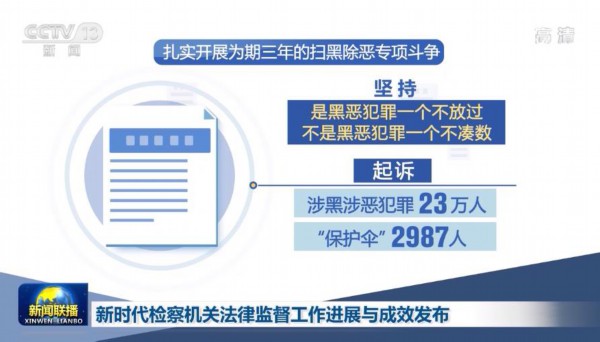 检察机关坚持总体国家安全观,依法惩治各类刑事犯罪。扎实开展为期三年的扫黑除恶专项斗争,坚持“是黑恶犯罪一个不放过、不是黑恶犯罪一个不凑数”,起诉涉黑涉恶犯罪23万人、“保护伞”2987人。