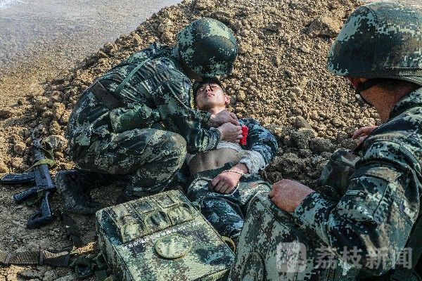 在卫生员比武考场,参赛选手全副武装,通过蛇形跑、低姿匍匐成功抵达指定地域,依托障碍物接连救治2名伤员,在战场条件下完成通气、止血、包扎、固定、搬运和基础生命支持6大战伤救护动作,将战伤救护“白金十分钟”展现得淋漓尽致。