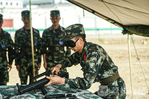 在军械保管员比武现场,蒙着双眼的参赛选手干脆利落地将1支手枪、1支步枪全部分解。随后裁判将部件打乱,参赛选手迅疾出手扫过部件堆,准确分辨出每个部件并一一组装到位,一连串动作用时仅1分52秒!