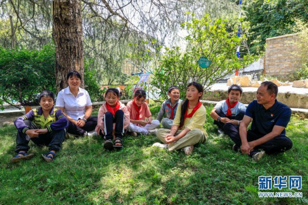 落松地小学的6名毕业生和农加贵老师(右一)、朱丽丹老师(左一)在校门口留影(摄于7月6日)。(新华网 赵普凡 摄)