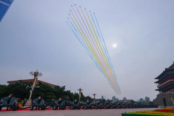 在庆祝中华人民共和国成立70周年阅兵式上,象征56个民族的56门迎宾礼炮呈“八”字形等距列阵。一声令下,炮阵交替鸣放、响彻云霄……