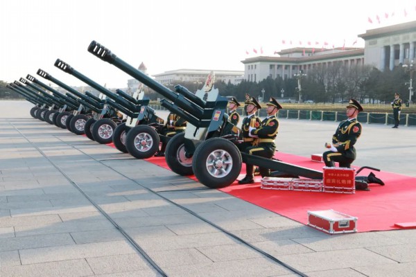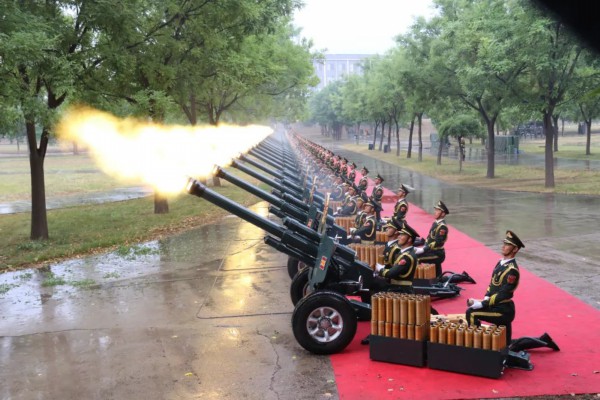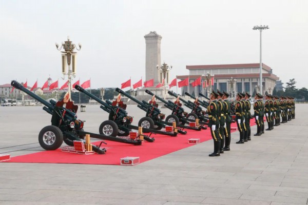 2019年7月22日,在欢迎阿联酋王储访华仪式开始前,室外突然下起倾盆大雨,迎宾仪式由天安门广场改在人民大会堂举行。其他人员全部进入室内,唯独礼炮兵跪在炮位上一动不动,如雕塑一般。