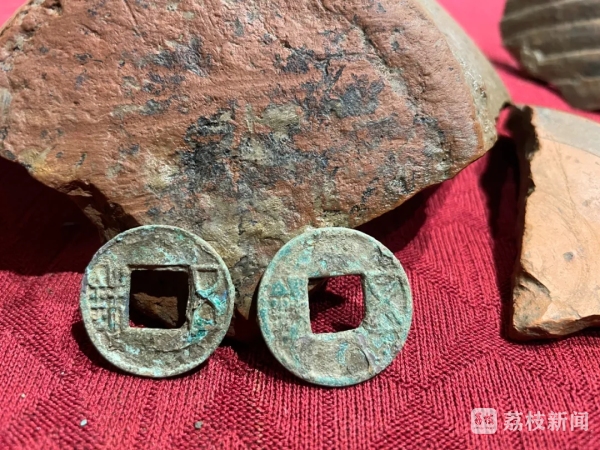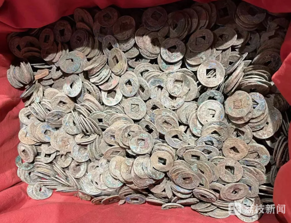 存钱的瓦罐已破碎,古钱币由于在水中浸泡时间已久,大部分粘黏在一起,重量约5公斤。经初步考证,古钱币为汉代五铢钱,距今已有约2000年历史。