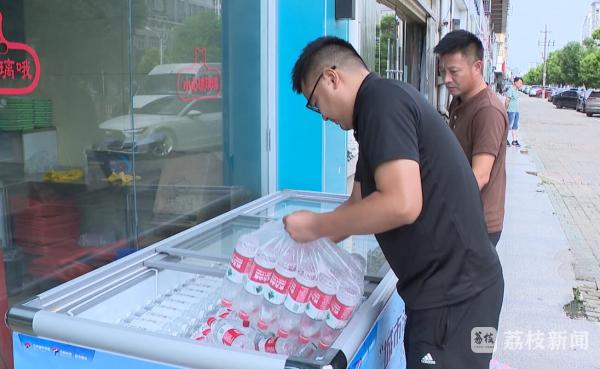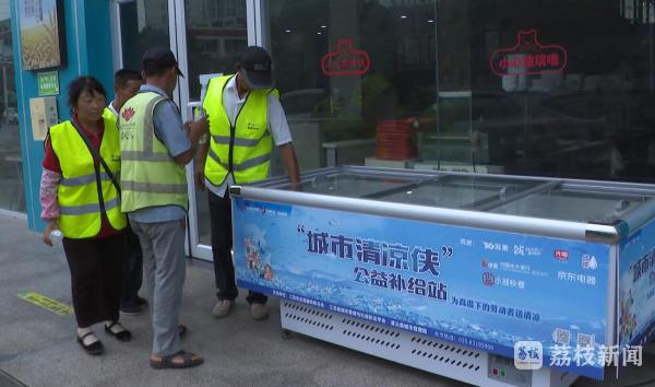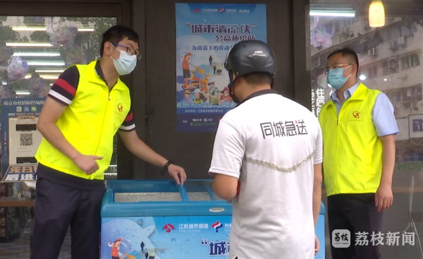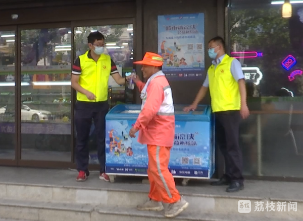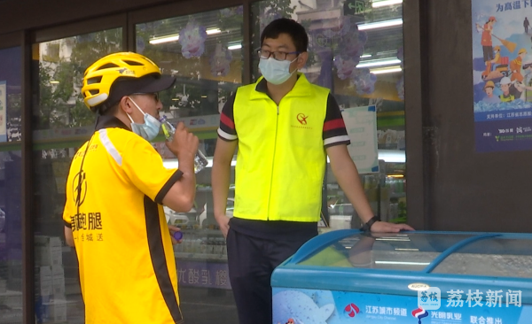 而在连云港灌云县,在爱心商家设置的“城市清凉侠”公益补给站点,不少户外工作者们停下脚步,领取清凉物资,同时门店内也开启了空调,供户外工作者歇脚休息。