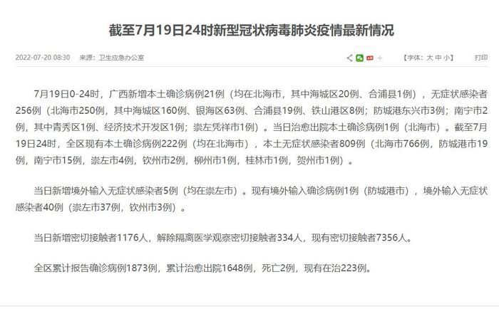 荔枝新闻讯 7月20日上午,广西壮族自治区卫健委发布《截至7月19日24时新型冠状病毒肺炎疫情最新情况》:7月19日0-24时,广西新增本土确诊病例21例(均在北海市,其中海城区20例、合浦县1例),无症状感染者256例(北海市250例,其中海城区160例、银海区63例、合浦县19例、铁山港区8例;防城港东兴市3例;南宁市2例,其中青秀区1例、经济技术开发区1例;崇左凭祥市1例)。当日治愈出院本土确诊病例1例(北海市)。截至7月19日24时,广西现有本土确诊病例222例(均在北海市),本土无症状感染者809例(北海市766例,防城港市19例,南宁市15例,崇左市4例,钦州市2例,柳州市1例,桂林市1例,贺州市1例)。