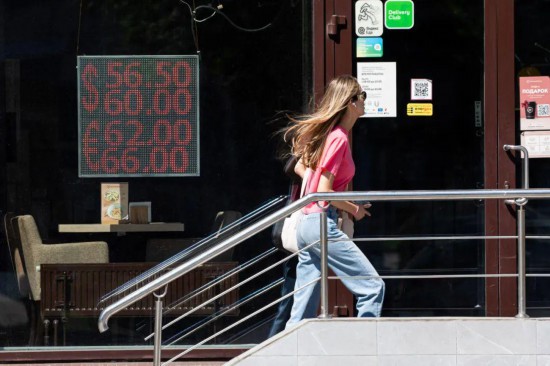 6月29日,在俄罗斯首都莫斯科,行人经过一处外汇兑换点的汇率显示屏。新华社记者 白雪骐 摄