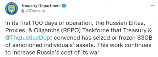 当地时间6月29日,美国司法部称,美国及其盟友已冻结了超过300亿美元的俄罗斯寡头的资产,相关专案组已经冻结了俄罗斯中央银行资金约3000亿美元。为了落实制裁、冻结资产,美国政府部门专门成立了一个名为REPO的多边工作组。REPO是俄罗斯精英、代理人和寡头的首字母缩写(Russian Elites, Proxies and Oligarchs)。