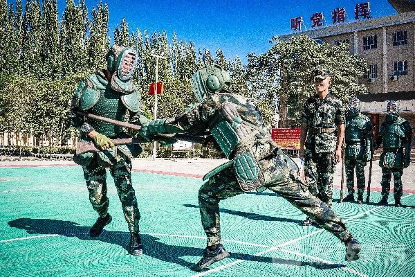 训练中,受训官兵严格按照动作要领,熟练运用突刺、防刺、击打刺等多种技战术手段进行攻击训练,有效检验了官兵刺杀对抗课目训练水平。