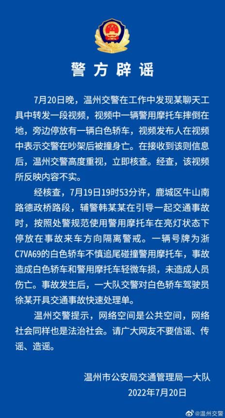 7月20日晚,温州交警在工作中发现某聊天工具中转发一段视频,视频中一辆警用摩托车摔倒在地,旁边停放有一辆白色轿车,视频发布人在视频中表示交警在吵架后被撞身亡。在接收到该则信息后,温州交警高度重视,立即核查。经查,该视频所反映内容不实。