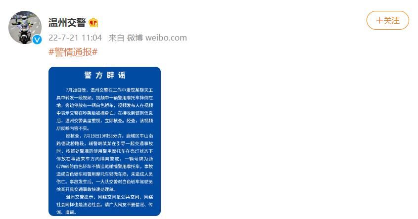 荔枝新闻讯 7月21日,“温州交警”微博发布一则警方辟谣: