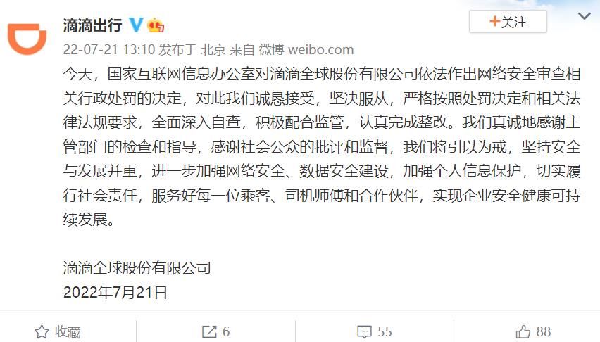 荔枝新闻讯 @滴滴出行 7月21日消息,今天,国家互联网信息办公室对滴滴全球股份有限公司依法作出网络安全审查相关行政处罚的决定,对此我们诚恳接受,坚决服从,严格按照处罚决定和相关法律法规要求,全面深入自查,积极配合监管,认真完成整改。我们真诚地感谢主管部门的检查和指导,感谢社会公众的批评和监督,我们将引以为戒,坚持安全与发展并重,进一步加强网络安全、数据安全建设,加强个人信息保护,切实履行社会责任,服务好每一位乘客、司机师傅和合作伙伴,实现企业安全健康可持续发展。